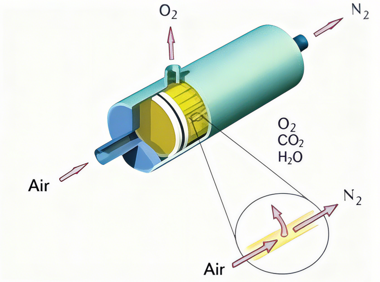 Gas separation membrane technology leverages the differences in permeation rates of various gas molecules through membrane materials to achieve separation, representing an emerging“green technology”. Compared to traditional gas separation techniques such as cryogenic deep cooling and pressure swing adsorption, membrane separation offers advantages including high efficiency, energy savings, flexible operation, simple and compact equipment, and environmental friendliness. It enables highly selective gas separation at ambient temperatures, thereby attracting widespread attention in both fundamental research and industrial applications. Since the 1980s, membrane separation processes have been applied across diverse gas separation fields, including: - Separating N2 from air - Separating CO2 from natural gas - Separating C2~C4 hydrocarbons in petrochemical plants - Extracting H2 in refineries and ammonia plants. In recent years, other emerging applications have developed, such as separating CO2/H2 mixtures, separating CO2/N2 for carbon capture, enriching oxygen/nitrogen in air, and separating olefins/paraffins.
